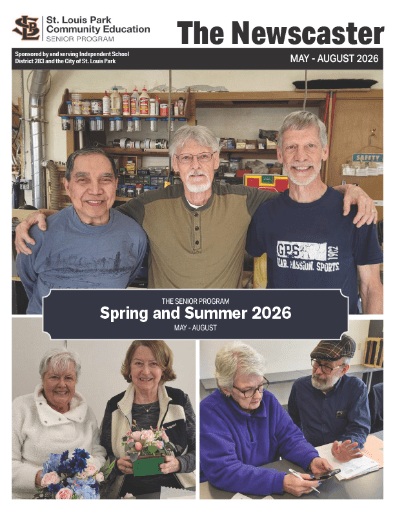 Our Mission: St. Louis Park Community Education enhances the quality of life through lifelong learning and empowerment of people. We support lifelong learning at every level, with programs for infants through senior citizens. You'll find a variety of classes, activities, and programs designed to keep you and your family engaged. St. Louis Park Community Education is a department of St. Louis Park Public Schools. Spring/Summer 2026Community EducationCatalogThe mission of the St. Louis Park Adult Enrichment Program is to support and motivate adults in our community to thrive by providing opportunities for personal growth and community connection. We have many in person and online classes to choose from. We frequently add new ones, so check back often! Click HERE to view or download our current catalog. Spring/Summer 2026Senior Newscaster Our mission is to improve and enhance the lives of adults age 50 and better in St. Louis Park and surrounding communities by offering a variety of programs including social, recreational, physical and educational opportunities, striving to provide cooperative programs with other service providers and being a resource to members, and having a warm and welcoming environment. Click HERE to read or download the current Newscaster. Spring/Summer 2026Youth Enrichment CatalogSt. Louis Park Youth Enrichment provides lifelong learning opportunities for students in grades K-12. With multiple offerings at all St. Louis Park elementary schools, evening and weekend classes, and a complete summer program, we have something for everyone! We frequently add new ones, so check back often! Click HERE to view or download our current catalog. Winter 2026 Community Education CatalogThe mission of the St. Louis Park Adult Enrichment Program is to support and motivate adults in our community to thrive by providing opportunities for personal growth and community connection. We have many in person and online classes to choose from. We frequently add new ones, so check back often! Click HERE to view or download our current catalog. Winter 2026Senior Newscaster Our mission is to improve and enhance the lives of adults age 50 and better in St. Louis Park and surrounding communities by offering a variety of programs including social, recreational, physical and educational opportunities, striving to provide cooperative programs with other service providers and being a resource to members, and having a warm and welcoming environment. Click HERE to read or download the current Newscaster. Forgot your password?Click here for password help New to our system?Click here to create a New Account See Upcoming EventsUpcoming Events Frequently Asked QuestionsFAQs Community Education Adult & Senior Enrichment Adult Options in Education Adults with DisabilitiesProject SOAR Lenox Programming Aquatics Facility Rentals Early Education & SCreening Birth - Age 5 Early Childhood Family Education Early Learning Preschool Early Childhood Screening Kids Place for Preschoolers Birth — 5 Enrichment Parent/Family Resources Kindergarten - Grade 12 Youth Enrichment Kids Place School-Age Summer Enrichment Camps Driver’s Education Featured Classes Please join us! We have classes designed with you in mind. You'll find online options and in-person experiences. See some of our featured classes below! Youth Matsubayashi Shorin-Ryu KarateGet introduced to techniques and practices including: stances, strikes, and blocks! Register Here! Middle School Micro-C ClubJoin us for Middle School Micro-C Club to learn about micro-controllers and more! Register Here! Driver's EducationFrom A+ Driving School-for students 14.5-17 years old. Register Here! Centerpieces Made Easy Workshop Join us for a fun, hands-on class where you’ll learn easy techniques to design a beautiful centerpiece using simple, everyday materials. We’ll provide all the supplies—just bring your creativity and leave with a one-of-a-kind piece you made yourself! Register Here! Line Dance: Mamma Mia “Dancing Queen” Hit the dance floor with easy, follow-along choreography that gets everyone moving, grooving, and singing along. No partner needed—just bring your inner disco diva (and maybe a few friends!) for an hour of pure dance floor joy. Register Here! Intro. to Fly Fishing and Beginner Fly Casting Interested in learning about fly fishing, fly casting, and benefiting from the mental health attributes the sport offers? Join instructor Tom Kalgren for a fun introduction to fly fishing. Learn basic beginner information and fly rod fundamentals. Register Here!